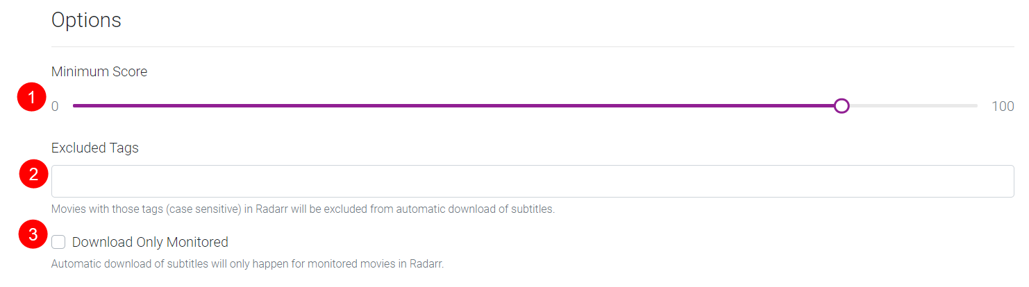 1. Select the minimum score (in percentage) required for a subtitle file to be downloaded.